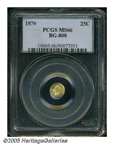 <B>1870<25C> Liberty Round 25 Cents, BG-808, R.4, MS66 PCGS.</B></I> A nicely struck and exceptionally clean piece with undisturbed mildly prooflike luster. The slightly wavy reverse has blushes of golden-brown and violet color. Population: 11 in 66, 0 finer (4/05).