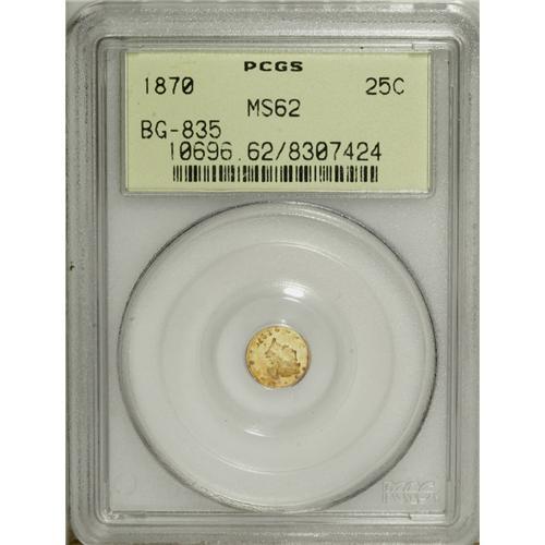 <B>1870 25C Liberty Round 25 Cents, BG-835, R.3, MS62 PCGS.</B></I> A highly reflective example of this scarce variety. Solidly struck, though slightly off-center toward 10 o'clock on the obverse. Population: 57 in 62, 28 finer (10/06).<BR><BR><b>Shipping:</b> Coin/Currency (<a target="_blank" href="http://www.heritageauctions.com/common/shipping.php">view shipping information</a>)