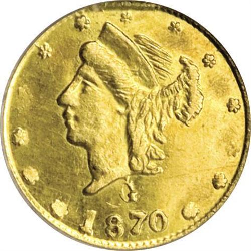 <B>1870 25C Liberty Round 25 Cents, BG-836, High R.7, MS61 NGC.</B></I> A very rare variety. The second edition of Breen-Gillio (2003) lists just four known examples. Nonetheless, there are two important die states. The present piece is State One, the "Fresh Reverse" prior to die polishing that removed stems to create floating berries. This semi-prooflike yellow-gold example is undisturbed save for a few faint slide marks on each side. Stars 4 and 11 are bluntly struck.<BR><BR><b>Shipping:</b> Coin/Currency (<a target="_blank" href="http://www.heritageauctions.com/common/shipping.php">view shipping information</a>)