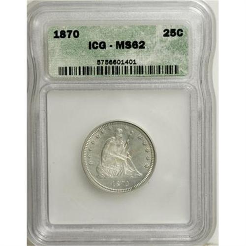 <B>1870 25C MS62 ICG.</B></I> This piece has satiny silver luster with full mint brilliance. All of the design features on each side are boldly struck. The fields are reflective, providing light contrast. Business strikes of this date are quite rare in Mint State grades.<BR><BR><b>Shipping:</b> Coins & Currency (<a target="_blank" href="http://www.heritageauctions.com/common/shipping.php">view shipping information</a>)