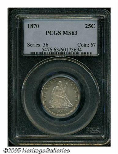 <B>1870<25C> MS63 PCGS.</B></I> The obverse of this example has heavy clash marks and die polishing lines in the fields, while the reverse is crisp and free of die defects. This is a low-mintage issue that is seldom encountered in Mint State. Sharply struck with soft pastel colors over satiny silver luster. Population: 2 in 63, 12 finer (5/05).