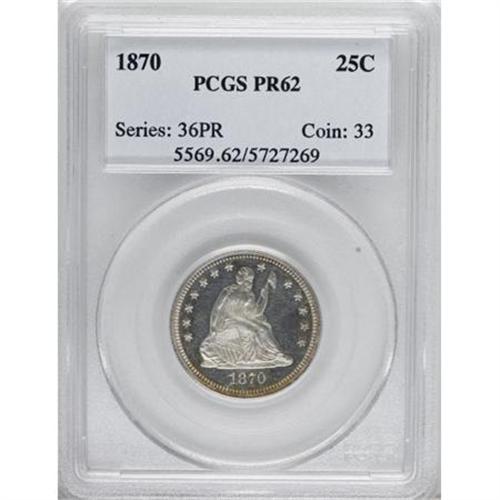 <B>1870 25C PR62 PCGS.</B></I> PCGS Population (36/73). NGC Census: (9/87). Mintage: 1,000. Numismedia Wsl. Price for NGC/PCGS coin in PR62: $520. (#5569)<BR><BR><b>Shipping:</b> Coins & Currency (<a target="_blank" href="http://www.heritageauctions.com/common/shipping.php">view shipping information</a>)