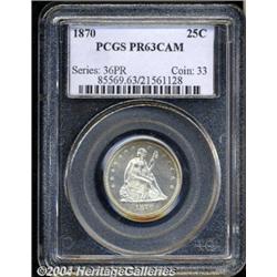 <B>1870<25C> PR63 Cameo PCGS.</B></I> Moderately frosted devices appear to float on the glassy, reflective fields. Aside from hints of color on the rims, the bright surfaces are nearly untoned, and virtually free of significant abrasions. The design elements are nicely struck, save for softness in Liberty's hair and in the centers of the stars on the right side. A few wispy hairlines in the obverse fields do not take away from the attractiveness of this lovely Seated Liberty quarter. Population: 1 in 63, 11 finer (3/04).<BR><I>From The Barry Donnell Collection.</B></I> <BR><BR><B>Important notice:</B> Heritage usually auctions material at the rate of 200-250 lots per hour. On some occasions eBay Live bid software or the Internet may not be able to keep up with the pace of the auction. We recommend placing a realistic absentee bid now as insurance to avoid disappointment. Occasionally the auctioneer may eliminate or reject an eBay Live bid, and the auctioneer may also reopen a lot after the close of the eBay live bidding (usually because we missed an audience bid), and may reject your bid even if it shows you as the winning bidder. By bidding via eBay Live, you agree that Heritage may award the lot to another bidder at its sole discretion under the circumstances described above or any other reasonable circumstances. Since eBay bids are not shown to us until we open the lot on the floor, we treat those bids just like floor bids. In most cases the floor responds before the eBay bid is presented to us, due to Internet lag time, so for consistency we have made it a policy that floor bids are always considered first over tie eBay live bids. Also please note that all Heritage lots purchased through eBay Live carry a 20% Buyer's Premium. Please make sure you read the Terms and Conditions before you bid.