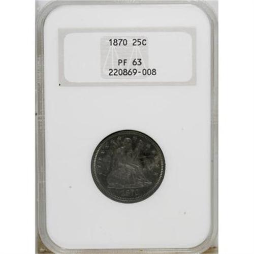 <B>1870 25C PR63 NGC.</B></I> NGC Census: (22/66). PCGS Population (31/42). Mintage: 1,000. Numismedia Wsl. Price for NGC/PCGS coin in PR63: $580. (#5569)<BR><BR><B>Coin Engraver:</B> Christian Gobrecht<BR><BR><b>Shipping:</b> Coins & Currency (<a target="_blank" href="http://www.heritageauctions.com/common/shipping.php">view shipping information</a>)