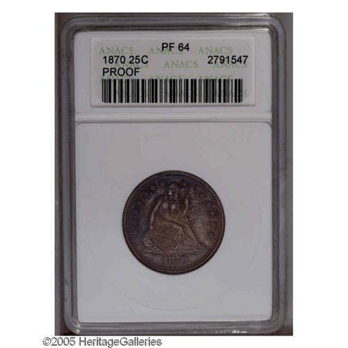 1870 25C PR64 ANACS. Deep ocean-blue colors emerge whe 1870[25C] PR64 ANACS.