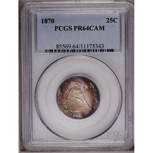 <B>1870<25C> PR64 Cameo PCGS.</B></I> Dramatic golden-brown, rose, and sea-green tones enrich this sharply struck and impressively preserved near-Gem. The seated Liberty demonstrates obvious contrast with the flashy obverse field. Population: 18 in 64 Cameo, 1 finer (4/06).