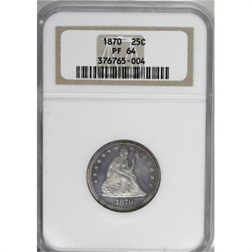 <B>1870 25C PR64 NGC.</B></I> Glassy fields offset lightly frosted design elements that are well impressed, except for softness in Liberty's hair and shoulders and stars 7 through 11. Lightly toned surfaces reveal a few wispy grade-defining marks. Census: 41 in 64, 25 finer (1/08).<BR><I>From The Southwest Collection.</B></I><BR><BR><B>Coin Engraver:</B> Christian Gobrecht<BR><BR><b>Shipping:</b> Coins & Currency (<a target="_blank" href="http://www.heritageauctions.com/common/shipping.php">view shipping information</a>)