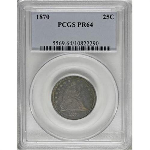 <B>1870 25C PR64 PCGS.</B></I> Blue-green, peach, and gold-orange patina graces the watery mirrors of this Seated near-Gem. The strike is crisp, and only a few tiny hairlines and contact marks appear in the fields. Population: 31 in 64, 11 finer (12/07).<BR><BR><B>Coin Engraver:</B> Christian Gobrecht<BR><BR><b>Shipping:</b> Coins & Currency (<a target="_blank" href="http://www.heritageauctions.com/common/shipping.php">view shipping information</a>)