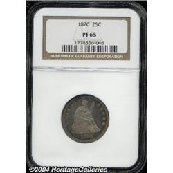 <B>1870<25C> PR65 NGC.</B></I> Briggs 2-B.This high grade proof is an important representative of a Seated Quarter date that is difficult to locate at <I>all</B></I> levels of business strike preservation. Both sides exhibit an original, colorful toning scheme displaying shades of medium gray that change to sunset-red, antique-gold, magenta, and cobalt-blue as the coin is rotated under a light. Struck from lightly rusted dies, although this feature is only really evident in the reverse field below the eagle's left (facing) wing. <BR><BR><B>Important notice:</B> Heritage usually auctions material at the rate of 200-250 lots per hour. On some occasions eBay Live bid software or the Internet may not be able to keep up with the pace of the auction. We recommend placing a realistic absentee bid now as insurance to avoid disappointment. Occasionally the auctioneer may eliminate or reject an eBay Live bid, and the auctioneer may also reopen a lot after the close of the eBay live bidding (usually because we missed an audience bid), and may reject your bid even if it shows you as the winning bidder. By bidding via eBay Live, you agree that Heritage may award the lot to another bidder at its sole discretion under the circumstances described above or any other reasonable circumstances. Since eBay bids are not shown to us until we open the lot on the floor, we treat those bids just like floor bids. In most cases the floor responds before the eBay bid is presented to us, due to Internet lag time, so for consistency we have made it a policy that floor bids are always considered first over tie eBay live bids. Also please note that all Heritage lots purchased through eBay Live carry a 20% Buyer's Premium. Please make sure you read the Terms and Conditions before you bid.