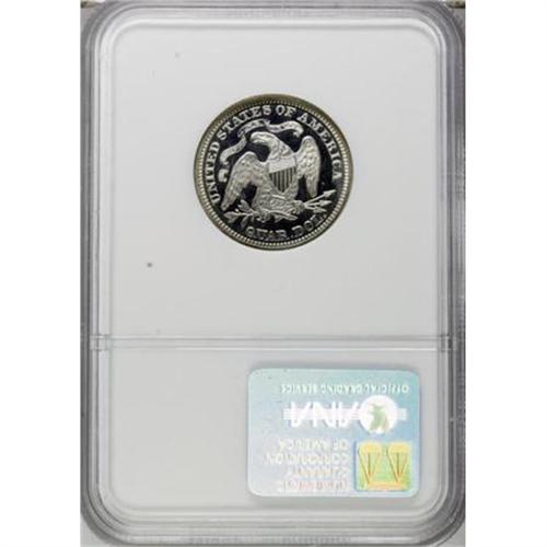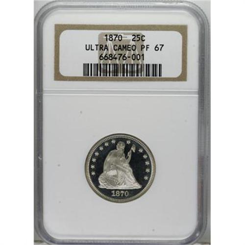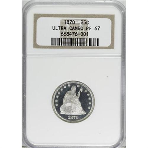 <B>1870 25C PR67 Deep Cameo NGC.</B></I> Briggs 2-B. One-thousand proof Seated Liberty quarters were stuck in 1870, a relatively high number for the With Motto type. Likewise, a correspondingly large number of proofs have been certified by NGC and PCGS (totaling about 235 examples). The two services, however, have seen fit to assign the Deep Cameo designation to a mere four coins (6/07), with the piece in this lot representing the finest!<BR> Deeply mirrored fields and heavily frosted motifs present breathtaking cameo contrast on both sides of this Superb Gem. Additionally, a powerful strike has imparted razor-sharp definition on the design elements, further enhancing the coin's outstanding eye appeal. Finally, close scrutiny with a glass reveals that untoned, impeccably preserved surfaces are devoid of mentionable marks. 1870 proof quarters were struck from rusted dies (Larry Briggs, <I>The Comprehensive Encyclopedia of United States Liberty Seated Quarters</B></I> 1991), some light evidence of which is visible beneath the eagle's right (left facing) wing. This is a truly super coin that is sure to generate spirited bidding.<BR><BR><b>Shipping:</b> Coins & Currency (<a target="_blank" href="http://www.heritageauctions.com/common/shipping.php">view shipping information</a>)
