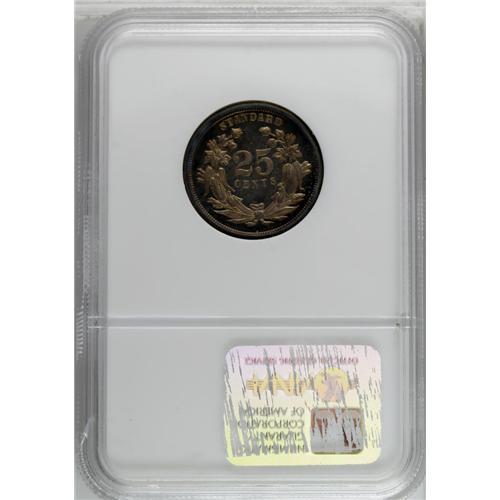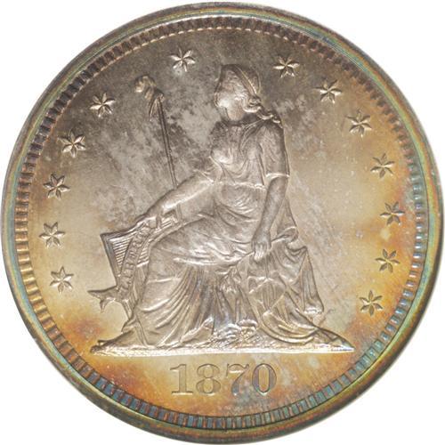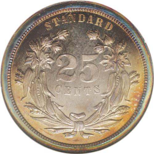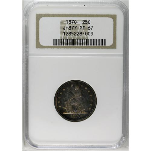 <B>1870<25C> Standard Silver Quarter Dollar, Judd-877, Pollock-974, Low R.7, PR67 NGC.</B></I> The obverse displays a seated figure of Liberty facing left with thirteen stars arranged around the border and the date below. Liberty supports a shield with her left (facing) hand over which a scroll inscribed with LIBERTY is draped. The reverse depicts the denomination 25 CENTS within a wreath of cotton and corn. The word STANDARD is at the top. Struck in silver with a plain edge. This shimmering example is every bit the Superb Gem: smooth surfaces, crisply impressed devices, and gorgeous original toning. Olive, orange, pink, and lilac-blue shades are all evident on both sides of this beautiful pattern.<I>Ex: Atlanta ANA Signature (Heritage, 8/01), lot 8367.</B></I>