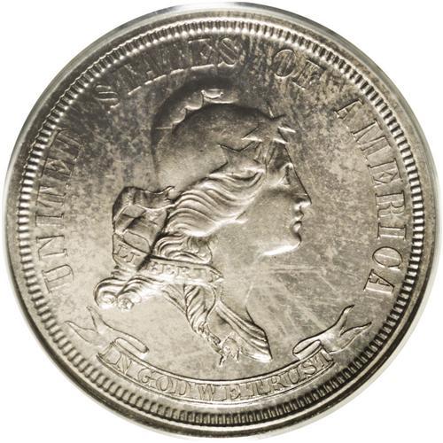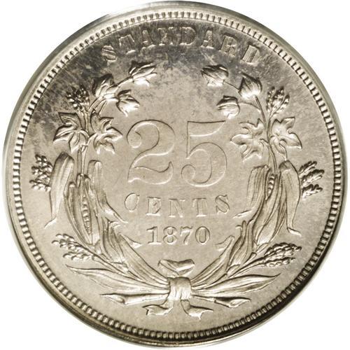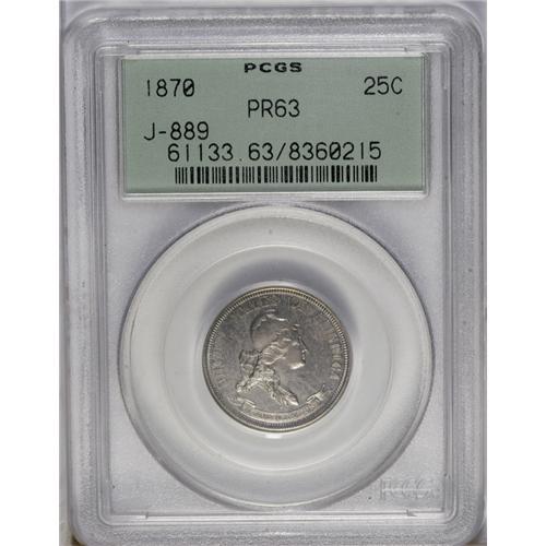 <B>1870<25C> Standard Silver Quarter Dollar, Judd-889, Pollock-988, Low R.7, PR63 PCGS.</B></I> A bust of Liberty wearing a cap ornamented with three stars facing right, the legend UNITED STATES OF AMERICA surrounds the figure, and a scroll with IN GOD WE TRUST is below. The reverse reads 25 CENTS 1870 in the center and is surrounded by a wreath of cotton and corn. Struck in silver with a plain edge and, as such, much scarcer than the reeded edge variant. This is a lightly patinated specimen with a few miniscule facial marks. Population: 4 in 63, 1 finer (7/06).