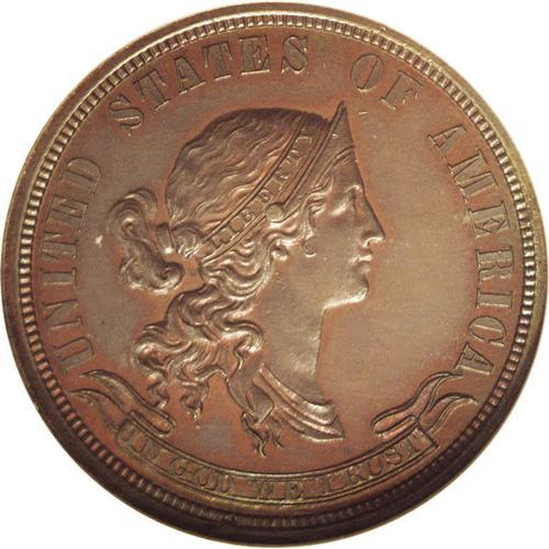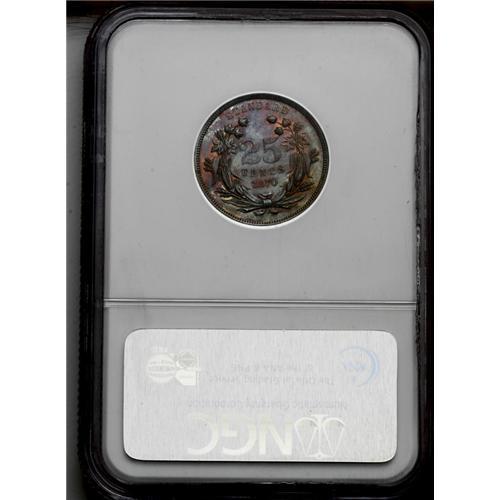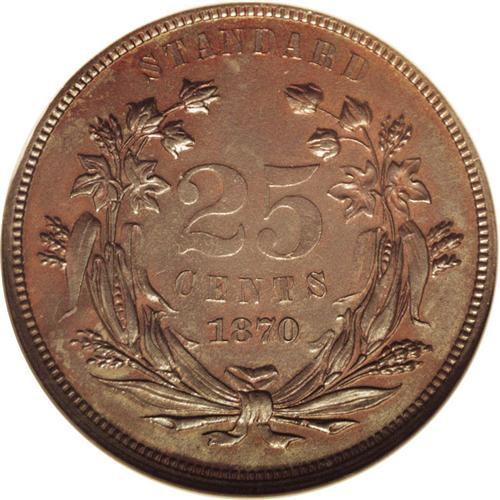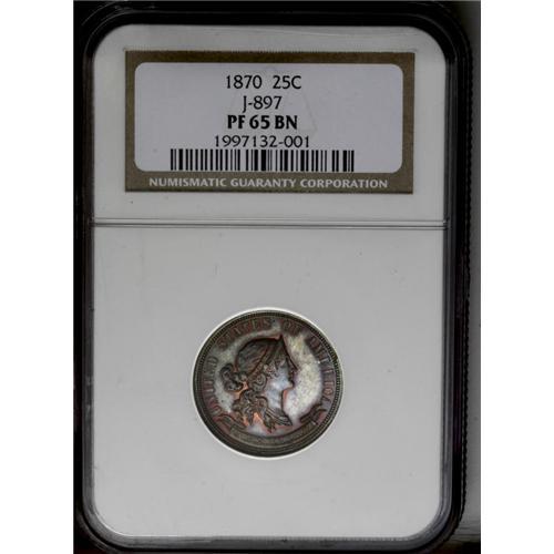 <B>1870<25C> Standard Silver Quarter Dollar, Judd-897, Pollock-1004, High R.7, PR65 Brown NGC.</B></I> Liberty wears a starless tiara. A corn and cotton wreath surrounds the legends 25/CENTS/1870. These dies are usually found in silver format, but this piece is struck in copper with a plain edge. Powder-blue fields and devices are outlined by generous fire-red iridescence. Well struck on the portrait, although the 25 is slightly soft. The surfaces exhibit interesting crystal-like raised striations, which are more prominent on the obverse. NGC has certified only three examples of Judd-897, with just one finer as PR66 Red and Brown (6/06). The sole PCGS-certified piece grades PR64 Brown.