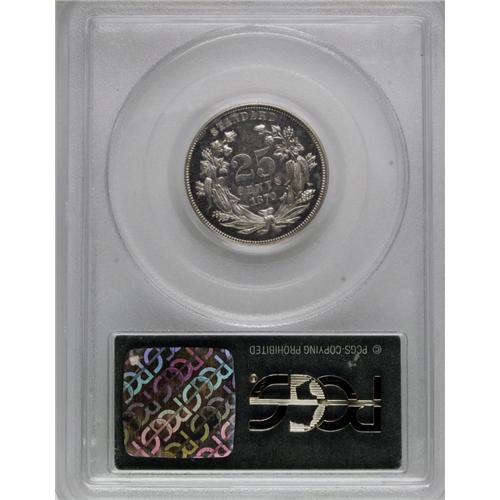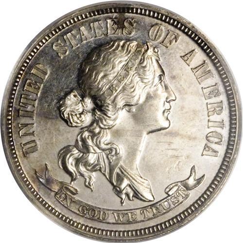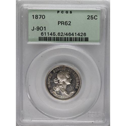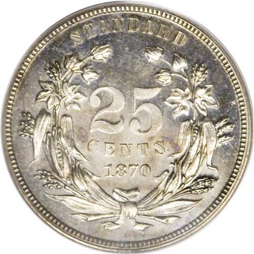 <B>1870 25C Standard Silver Quarter Dollar, Judd-901, Pollock-1016, High R.6, PR62 PCGS.</B></I> The bust of Liberty faces right on the obverse, with UNITED STATES OF AMERICA around and the motto IN GOD WE TRUST on a scroll below. Liberty's hair is tied in a bun, and her headband is ornamented with a star. On the reverse, the denomination 25 CENTS and date 1870 are in a wreath of cotton and corn, with the inscription STANDARD above. Struck in silver with a plain edge. About a dozen pieces are known of this pattern. Each side is mostly brilliant, with a few specks of color here and there. A bit of light contrast is evident between the fields and devices.<BR><BR><b>Shipping:</b> Coins & Currency (<a target="_blank" href="http://www.heritageauctions.com/common/shipping.php">view shipping information</a>)