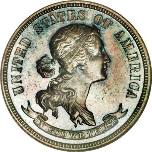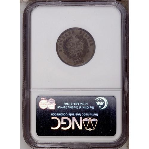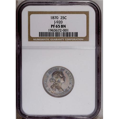 <B>1870 25C Standard Silver Quarter Dollar, Judd-920, Pollock-1024, High R.7, PR65 Brown NGC.</B></I> Liberty faces right and wears a headband ornamented by a large star. IN GOD WE TRUST is below within a scroll, and UNITED STATES OF AMERICA is above. The reverse displays STANDARD SILVER and the date respectively above and beneath an oak and laurel wreath, which crowds the denomination, 25 CENTS. Struck in copper with a reeded edge. Sharply struck, especially given the high relief of the portrait. Mostly golden-brown in color with aqua-blue obverse tints. A few faint hairlines are present on the slightly subdued reverse.