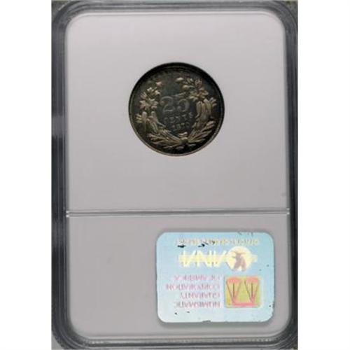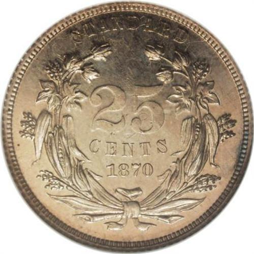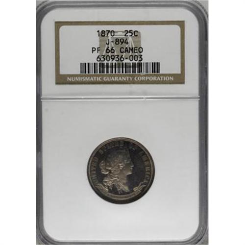 <B>1870 25C Standard Silver Quarter Dollar, Judd-894, Pollock-1001, R.5, PR66 Cameo NGC.</B></I> Standard Silver design with a bust of Liberty facing right on the obverse. Liberty wears a ribbon inscribed LIBERTY, the legend UNITED STATES OF AMERICA is at the periphery, the motto IN GOD WE TRUST is on a scroll below. The reverse depicts the denomination 25 CENTS and the date 1870 within a wreath of corn and cotton. The word STANDARD is at the top. Struck in silver with a reeded edge. The fields are deeply mirrored and there is significant contrast between the fields and devices. The reverse shows a number of obvious die striations and there are also a couple of lint marks that were struck into the planchet at the time of striking. Light rose colored toning is seen on each side.<BR><BR><b>Shipping:</b> Coins & Currency (<a target="_blank" href="http://www.heritageauctions.com/common/shipping.php">view shipping information</a>)