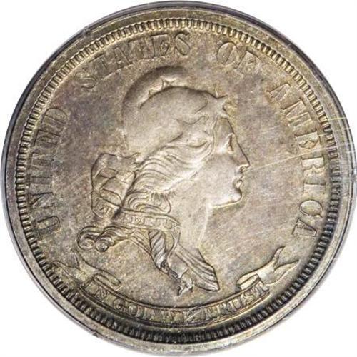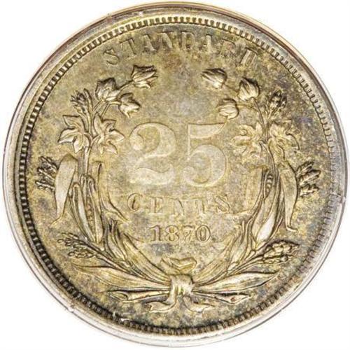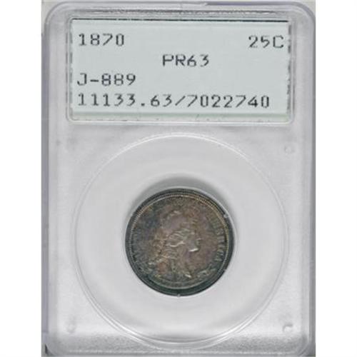 <B>1870 25C Standard Silver Quarter Dollar, Judd-889, Pollock-988, Low R.7, PR63 PCGS.</B></I> A bust of Liberty wearing a cap ornamented with three stars facing right, the legend UNITED STATES OF AMERICA surrounds the figure, and a scroll with IN GOD WE TRUST is below. The reverse reads 25 CENTS 1870 in the center and is surrounded by a wreath of cotton and corn. Struck in silver with a plain edge. Impressively smooth for the grade, and richly toned in aquamarine, steel-blue, and caramel-gold. In a first generation holder. Population: 4 in 63, 1 finer (11/07).<BR><BR><b>Shipping:</b> Coins & Currency (<a target="_blank" href="http://www.heritageauctions.com/common/shipping.php">view shipping information</a>)