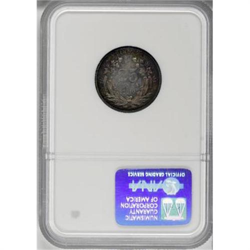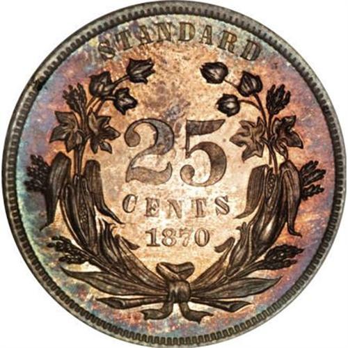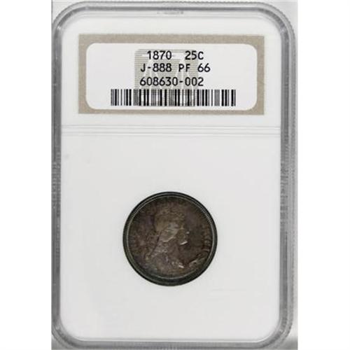 <B>1870 25C Standard Silver Quarter Dollar, Judd-888, Pollock-987, R.5, PR66 NGC.</B></I> A bust of Liberty wears a cap ornamented with three stars and faces right, the legend UNITED STATES OF AMERICA surrounds the figure, and a scroll with IN GOD WE TRUST is below. The reverse reads 25 CENTS 1870 in the center and is surrounded by a wreath of cotton and corn. Struck in silver with a reeded edge. The rich blue and rose toning partially obscure the depth of fields on the obverse, but the reverse is nearly brilliant in the center and displays a significant mirror-like effect beneath the golden-rose and blue toning that mostly hugs the margins. Superlative condition from a technical standpoint.<BR><BR><b>Shipping:</b> Coins & Currency (<a target="_blank" href="http://www.heritageauctions.com/common/shipping.php">view shipping information</a>)