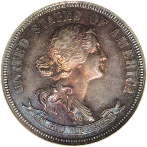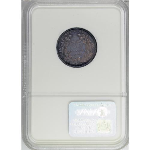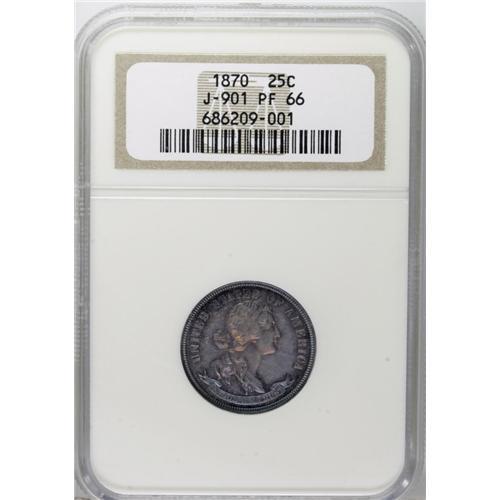 <B>1870 25C Standard Silver Quarter, Judd-901, Pollock-1016, High R.6, PR66 NGC.</B></I> Standard Silver Design C: Liberty wears a headband inscribed LIBERTY with her hair tied in a bun as more fully described for Judd-708. The reverse carries the denomination and date inside a wreath of corn and cotton with STANDARD above. Struck in silver with a plain edge. Deep golden-lilac and cobalt-blue toning subdues the proof surfaces of this magnificent Gem. Heavy polishing lines on the neck confirm that this obverse die is the same that was used for certain 1869 Standard Silver patterns.<BR><I>From The Jones Beach Collection.</B></I><BR><BR><b>Shipping:</b> Coin/Currency (<a target="_blank" href="http://www.heritageauctions.com/common/shipping.php">view shipping information</a>)