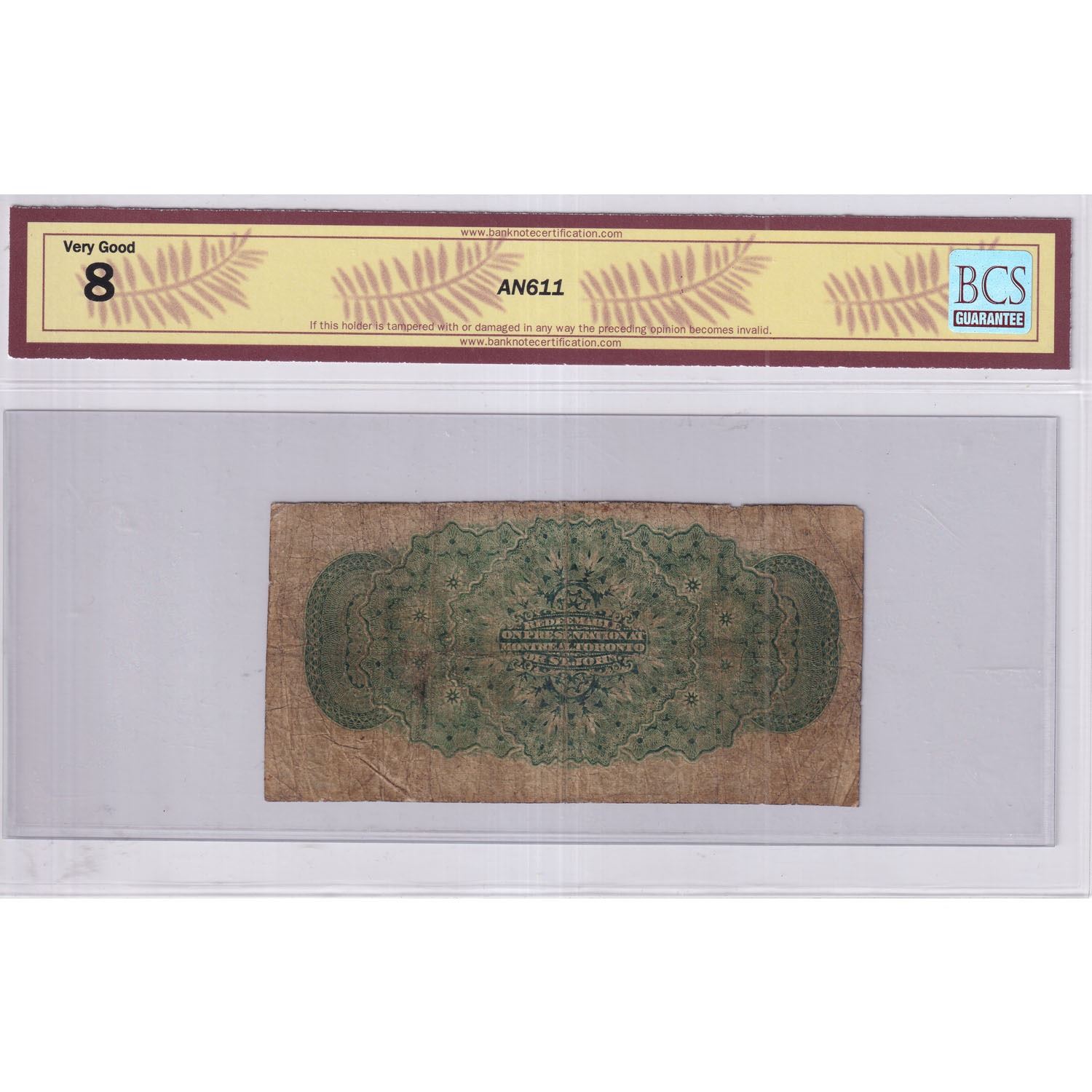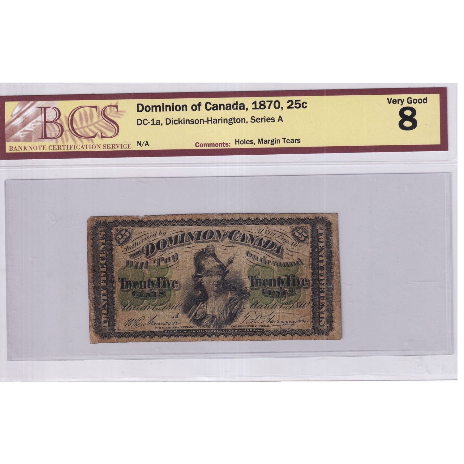 1870 25c DC-1a, Dominion of Canada, Dickinson-Harington, Series A, BCS Certified VG-8. Note contains