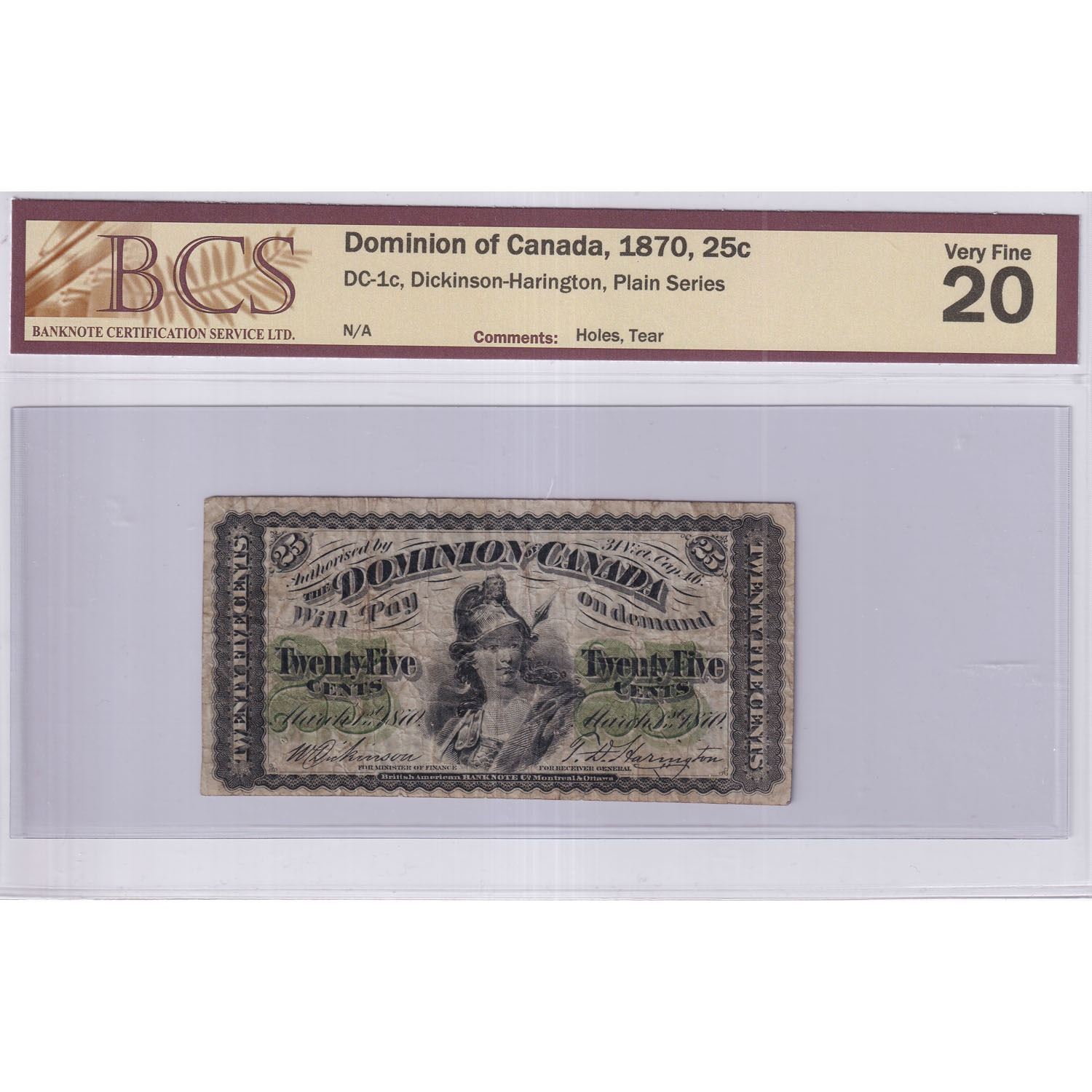 1870 25c DC-1c, Dominion of Canada, Dickinson-Harington, Plain Series, BCS Certified VF-20 (Holes, Tear).