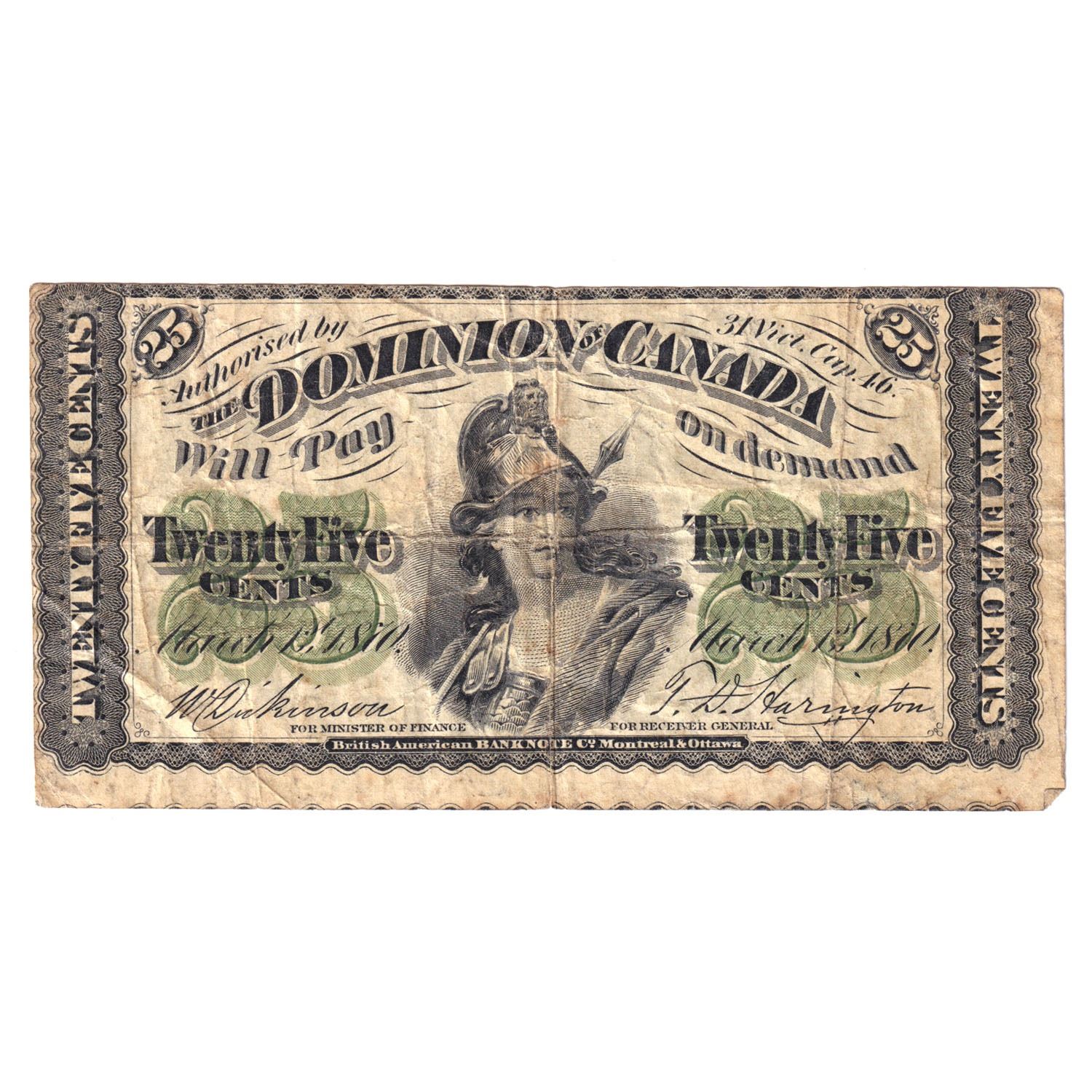 1870 25c DC-1c Dominion of Canada Note, Plain Series, Fine (Damaged).