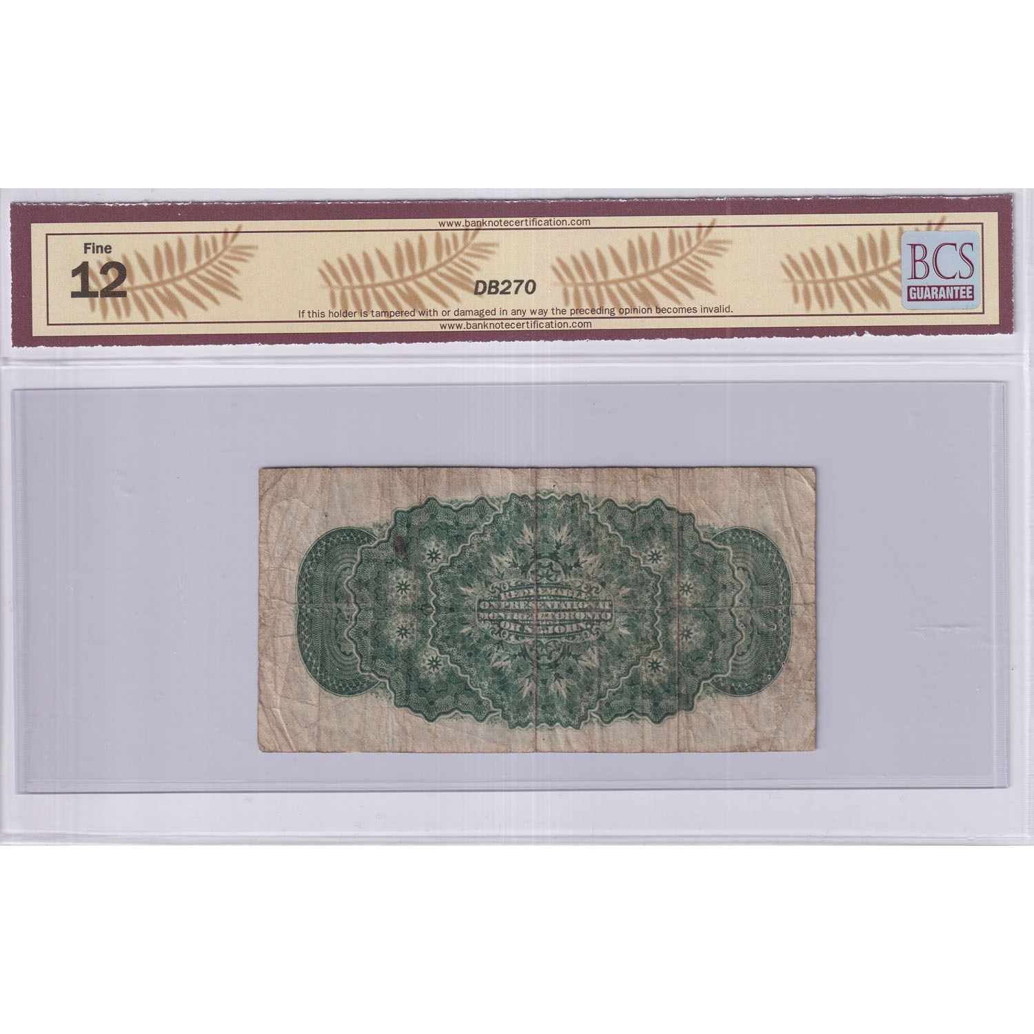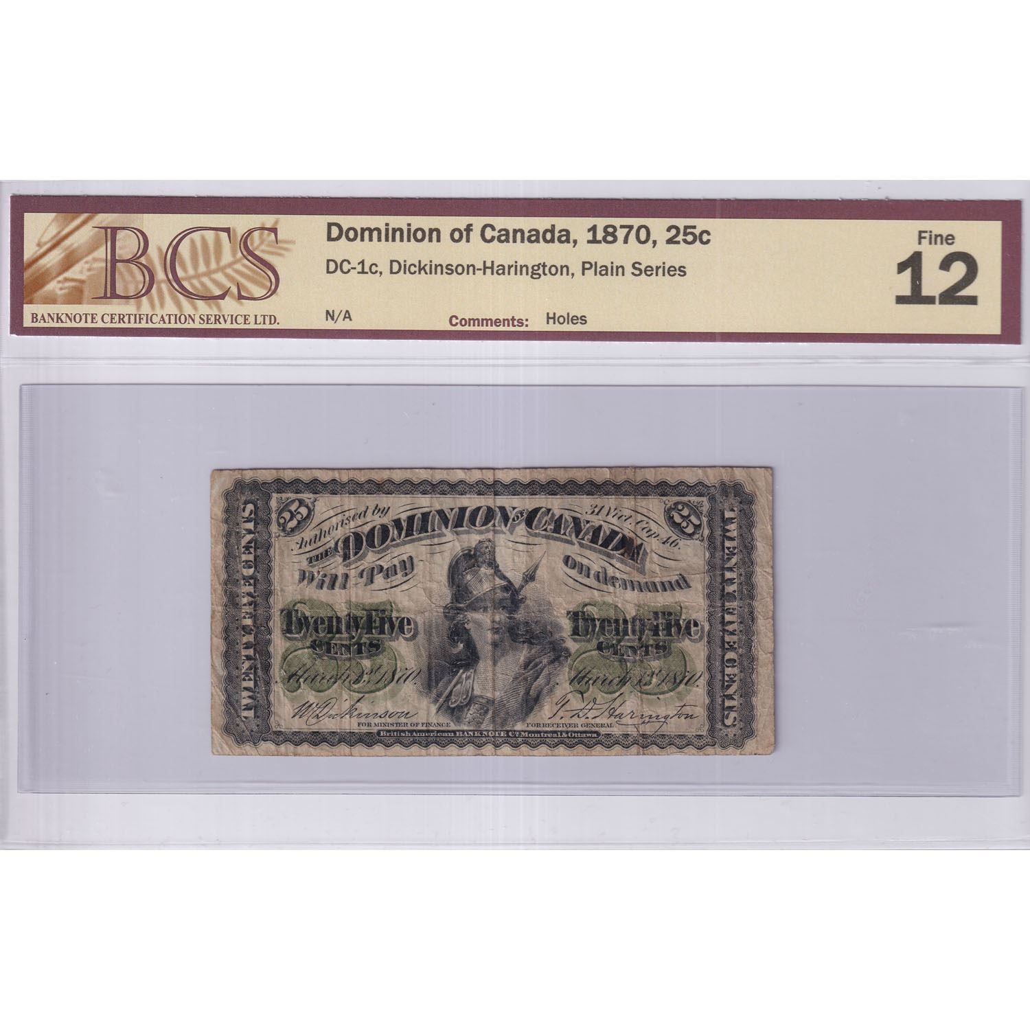 1870 25c DC-1c, Dominion of Canada, Plain Series, BCS Certified F-12. Note contains small holes mostly to the left side.