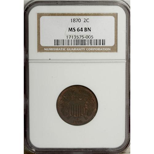 <B>1870 2C MS64 Brown NGC.</B></I> NGC Census: (30/14). PCGS Population (14/0). Mintage: 860,250. Numismedia Wsl. Price: $308. (#3606)<BR><BR><b>Shipping:</b> Coins & Currency (<a target="_blank" href="http://www.heritageauctions.com/common/shipping.php">view shipping information</a>)