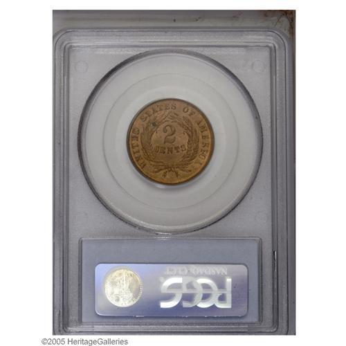 <B>1870<2C> MS64 Red PCGS.</B></I> A scarce coin with full mint red, this two cent piece has retained its attract effulgence and avoided numerous contact marks. Several darker spots, while not distracting in the least, are noticed at the upper left portion of the reverse. Population: 14 in 64, 12 finer (10/05).
