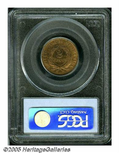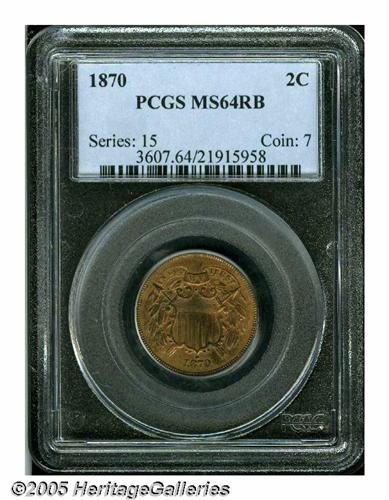<B>1870<2C> MS64 Red and Brown PCGS.</B></I> Considerable original orange color, exceeding 50%. The ideal collection of two-cent coins, at least in this cataloger's opinion, would be all MS64 or MS65 Red and Brown, each with exceptional surfaces for the grade, and with original mint color in the majority. This example would be a good place to start.