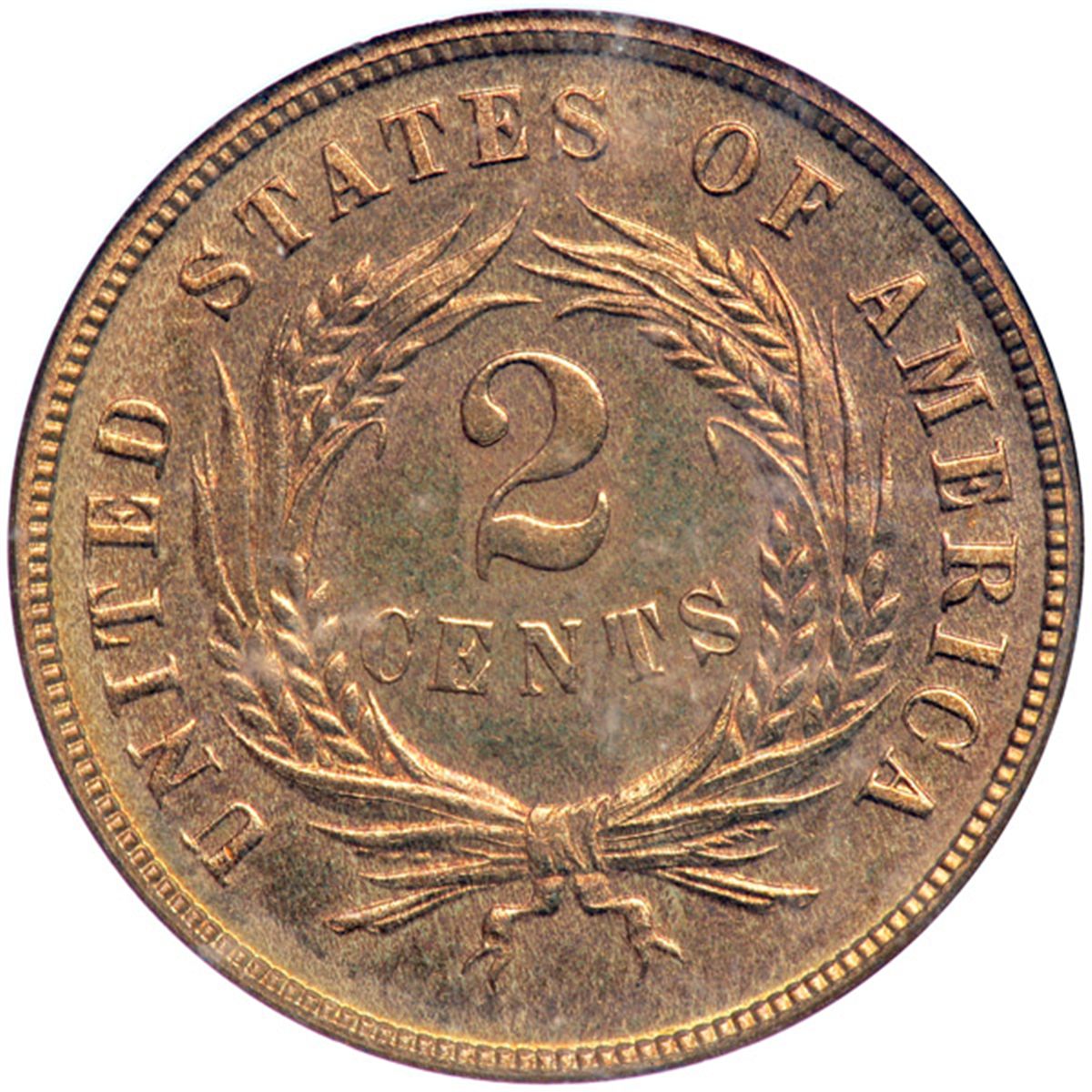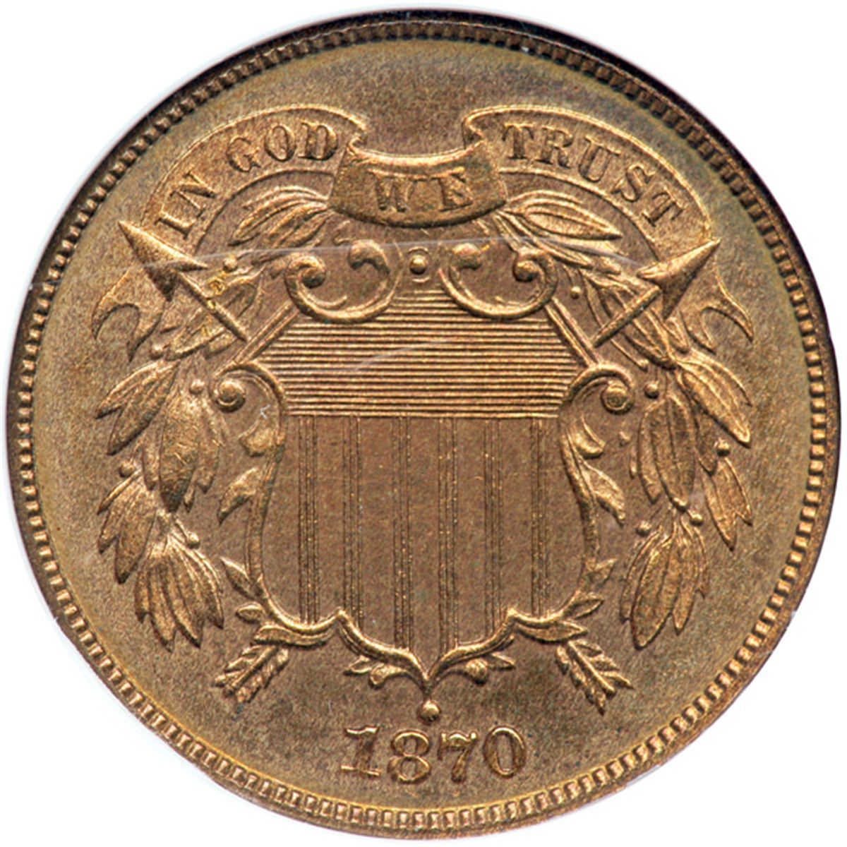 1870 Two Cents. NGC graded Proof 65 Red. A blazing full mint red gem example. About 1,000 or so Proofs made (mint records in those days are sometimes contradictory). A scarcity in this outstanding condition. Pop 22; 14 finer with 12 in 66, 2 in 67.