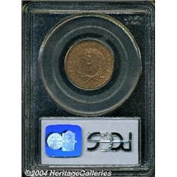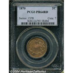 <B>1870<2C> PR64 Red PCGS.</B></I> Peach and pale-gold colors alternate across this nicely struck and unmarked near-Gem. The <I>Guide Book</B></I> reports a mintage of 1,000+ pieces, however, full Red specimens are not easy to find. Population: 42 in 64, 44 finer (9/04). <BR><BR><B>Important notice:</B> Heritage usually auctions material at the rate of 200-250 lots per hour. On some occasions eBay Live bid software or the Internet may not be able to keep up with the pace of the auction. We recommend placing a realistic absentee bid now as insurance to avoid disappointment. Occasionally the auctioneer may eliminate or reject an eBay Live bid, and the auctioneer may also reopen a lot after the close of the eBay live bidding (usually because we missed an audience bid), and may reject your bid even if it shows you as the winning bidder. By bidding via eBay Live, you agree that Heritage may award the lot to another bidder at its sole discretion under the circumstances described above or any other reasonable circumstances. Since eBay bids are not shown to us until we open the lot on the floor, we treat those bids just like floor bids. In most cases the floor responds before the eBay bid is presented to us, due to Internet lag time, so for consistency we have made it a policy that floor bids are always considered first over tie eBay live bids. Also please note that all Heritage lots purchased through eBay Live carry a 20% Buyer's Premium. Please make sure you read the Terms and Conditions before you bid.