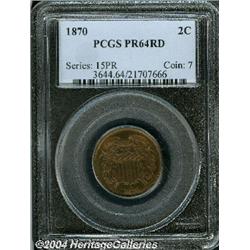 <B>1870<2C> PR64 Red PCGS.</B></I> This is a wonderful and Choice Proof example with exceptional eye appeal. The surfaces have numerous tiny abrasions resulting from the original planchet and not a product of later handling. <BR><BR><B>Important notice:</B> Heritage usually auctions material at the rate of 200-250 lots per hour. On some occasions eBay Live bid software or the Internet may not be able to keep up with the pace of the auction. We recommend placing a realistic absentee bid now as insurance to avoid disappointment. Occasionally the auctioneer may eliminate or reject an eBay Live bid, and the auctioneer may also reopen a lot after the close of the eBay live bidding (usually because we missed an audience bid), and may reject your bid even if it shows you as the winning bidder. By bidding via eBay Live, you agree that Heritage may award the lot to another bidder at its sole discretion under the circumstances described above or any other reasonable circumstances. Since eBay bids are not shown to us until we open the lot on the floor, we treat those bids just like floor bids. In most cases the floor responds before the eBay bid is presented to us, due to Internet lag time, so for consistency we have made it a policy that floor bids are always considered first over tie eBay live bids. Also please note that all Heritage lots purchased through eBay Live carry a 20% Buyer's Premium. Please make sure you read the Terms and Conditions before you bid.