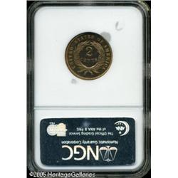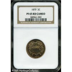 <B>1870 2C PR65 Cameo NGC.</B></I> Coppery-gold surfaces display a nice cameo effect, especially when the coin is rotated beneath a light source. The design elements are adequately struck up. A few light flecks are seen on the obverse. Lot:5639
