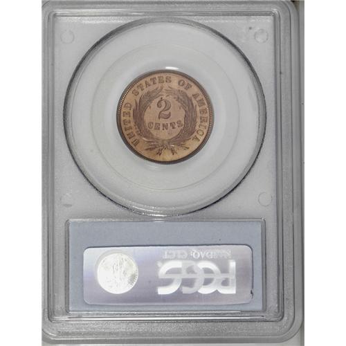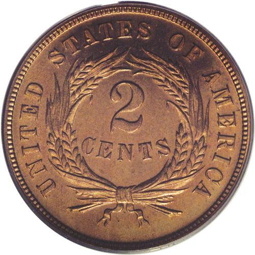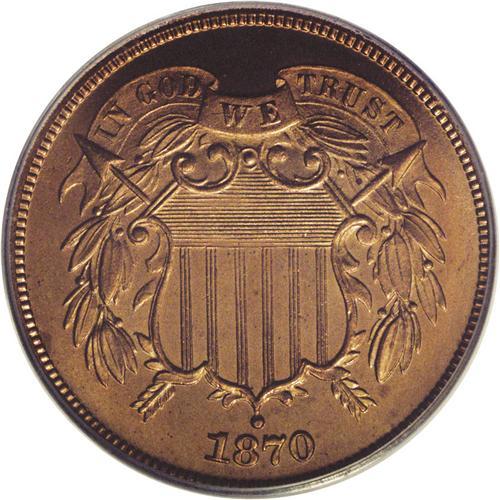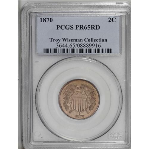 <B>1870 2C PR65 Red PCGS.</B></I> One of the most appealing coins in the stunning Troy Wiseman Collection of two cent pieces, this specimen offers light golden-tan surfaces that appear completely pristine to the unaided eye. The center shield stripes are weak from die lapping, as always seen on this issue, and the top serif of the D in UNITED is missing.<BR><I>From The Troy Wiseman Collection.</B></I><BR><BR><b>Shipping:</b> Coin/Currency (<a target="_blank" href="http://www.heritageauctions.com/common/shipping.php">view shipping information</a>)