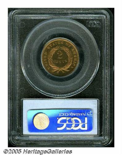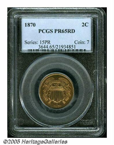 <B>1870<2C> PR65 Red PCGS.</B></I> Pleasing brick-red color with fully reflective fields and no noticeable spots or blemishes. An attractive Gem proof two-cent piece. Population: 37 in 65 Red, 9 finer (6/05).