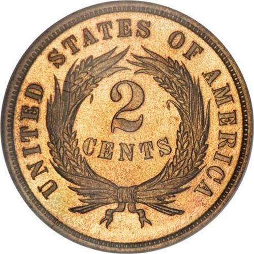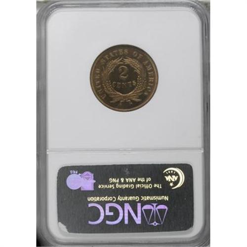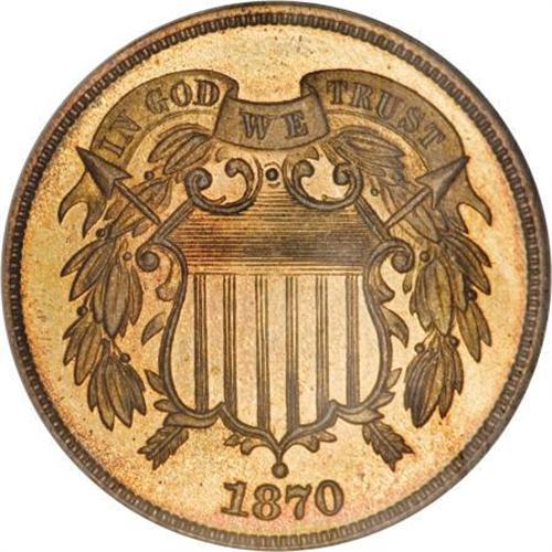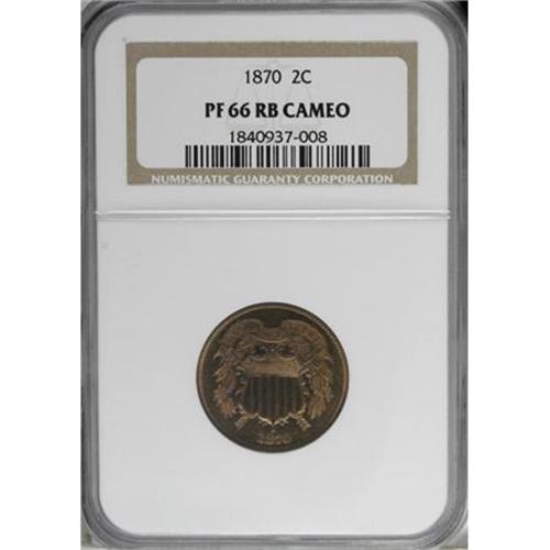 <B>1870 2C PR66 Red and Brown Cameo NGC.</B></I> This prominently mirrored Premium Gem displays variegated honey-gold and cherry-red. The strike is penetrating, and both sides are remarkably void of both contact and carbon. Although the Guide Book reports a mintage of 1,000+ proofs, the NGC and PCGS census data suggests a much lower net mintage. Bowers suggests as much in his silver dollar encyclopedia under the 1870 Seated dollar, "the scarcity of survivors suggests that quantities may have remained unsold at the end of the year and were melted."<BR><BR><B>Coin Engraver:</B> James B. Longacre<BR><BR><b>Shipping:</b> Coins & Currency (<a target="_blank" href="http://www.heritageauctions.com/common/shipping.php">view shipping information</a>)