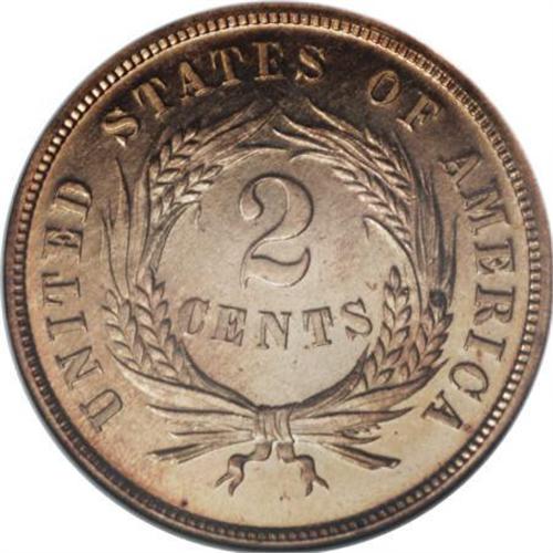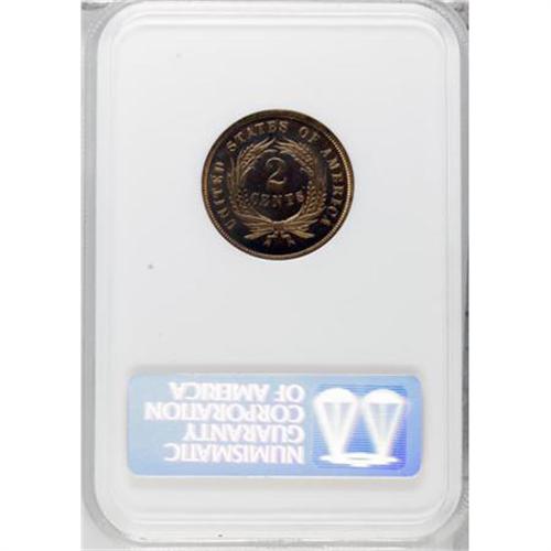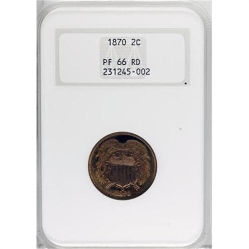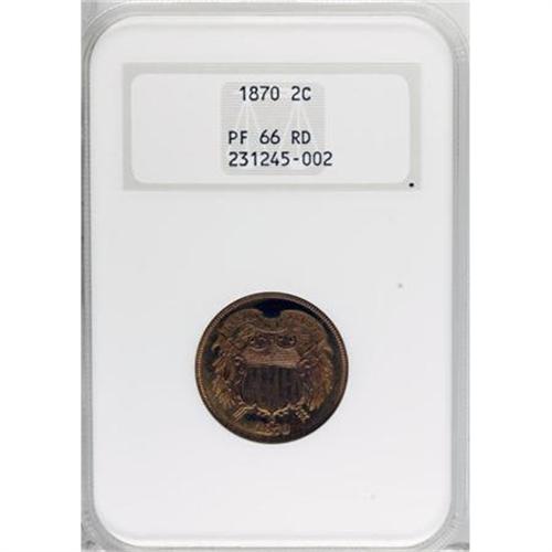 <B>1870 2C PR66 Red NGC.</B></I> Somewhat over 1,000 proof two cent pieces were produced in 1870. NGC and PCGS combined have assigned the full Red color designation to approximately 140 specimens, primarily through the Gem level of preservation. Blazing mint orange exudes from both sides of this wonderful two center, and sharp design elements prevail. A small toning spot is noted on the right-side wreath. Census: 11 in 66 Red, 2 finer (6/07).<BR><BR><b>Shipping:</b> Coins & Currency (<a target="_blank" href="http://www.heritageauctions.com/common/shipping.php">view shipping information</a>)