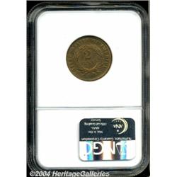 <B>1870<2C> PR66 Red and Brown NGC.</B></I> Crisply struck, with bright, golden-orange surfaces. A couple of flecks are noted in the left reverse field. Population: 12 in 66, 0 finer (7/04). <BR><BR><B>Important notice:</B> Heritage usually auctions material at the rate of 200-250 lots per hour. On some occasions eBay Live bid software or the Internet may not be able to keep up with the pace of the auction. We recommend placing a realistic absentee bid now as insurance to avoid disappointment. Occasionally the auctioneer may eliminate or reject an eBay Live bid, and the auctioneer may also reopen a lot after the close of the eBay live bidding (usually because we missed an audience bid), and may reject your bid even if it shows you as the winning bidder. By bidding via eBay Live, you agree that Heritage may award the lot to another bidder at its sole discretion under the circumstances described above or any other reasonable circumstances. Since eBay bids are not shown to us until we open the lot on the floor, we treat those bids just like floor bids. In most cases the floor responds before the eBay bid is presented to us, due to Internet lag time, so for consistency we have made it a policy that floor bids are always considered first over tie eBay live bids. Also please note that all Heritage lots purchased through eBay Live carry a 20% Buyer's Premium. Please make sure you read the Terms and Conditions before you bid. </span></font></tr></table></td></tr></table>