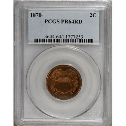 <B>1870 2C PR64 Red PCGS.</B></I> PCGS Population (41/46). NGC Census: (28/33). Mintage: 1,000. Numismedia Wsl. Price for NGC/PCGS coin in PR64: $1,050. (#3644)<BR><BR><B>Coin Engraver:</B> James B. Longacre<BR><BR><b>Shipping:</b> Coins & Currency (<a target="_blank" href="http://www.heritageauctions.com/common/shipping.php">view shipping information</a>)