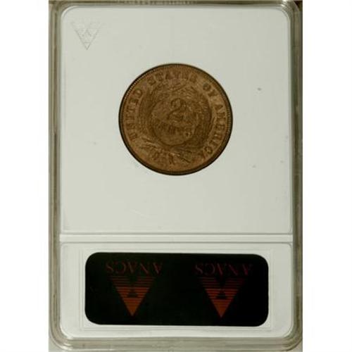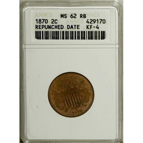 <B>1870 2C Red and Brown--Repunched Date--MS62 ANACS. </B></I>KF-4. NGC Census: (2/122). PCGS Population (6/149). Numismedia Wsl. Price for NGC/PCGS coin in MS62: $225. (#3607)<BR><BR><B>Coin Engraver:</B> James B. Longacre<BR><BR><b>Shipping:</b> Coins & Currency (<a target="_blank" href="http://www.heritageauctions.com/common/shipping.php">view shipping information</a>)