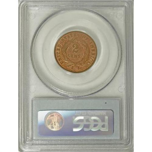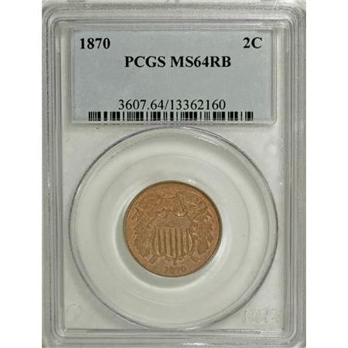 <B>1870 2C MS64 Red and Brown PCGS.</B></I> PCGS Population (82/16). NGC Census: (68/41). Numismedia Wsl. Price for NGC/PCGS coin in MS64: $665. (#3607)<BR><BR><B>Coin Engraver:</B> James B. Longacre<BR><BR><b>Shipping:</b> Coins & Currency (<a target="_blank" href="http://www.heritageauctions.com/common/shipping.php">view shipping information</a>)