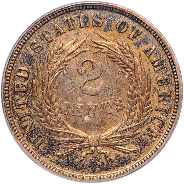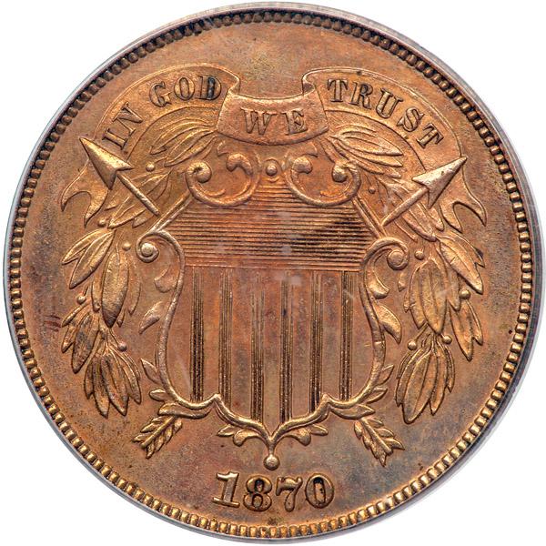 1870 Two Cents. PCGS graded Proof 62 Red & Brown. Approximately 1,000 proofs were struck in 1870. Choice, well struck, with all the finer detail clearly evident (PCGS # 3643) .