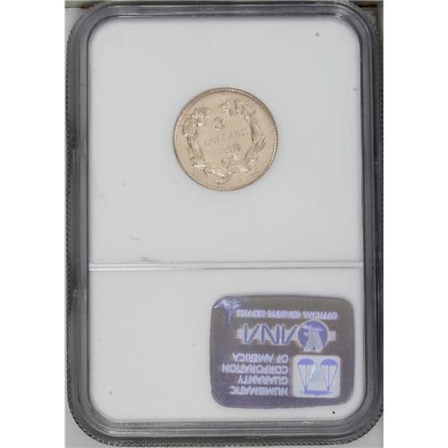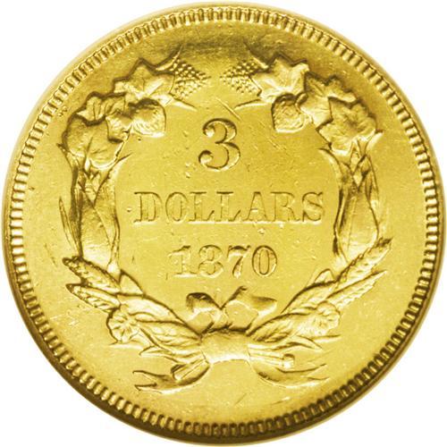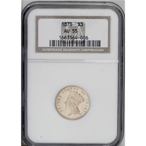 <B>1870<$3> AU55 NGC.</B></I> Much prooflikeness remains on the lightly circulated surfaces, which are an appealing canary-yellow color with a tinge of copper on the obverse rim. Light die striae are visible on each side, and the leaf to the left of the date is mostly absent due to overpolishing of the die. Choice AU three dollar gold pieces appear to be a neglected area in today's gold market, and one that may be ripe for some "choice" acquisitions for astute collectors.<BR><I>From The Tide Collection.</B></I>