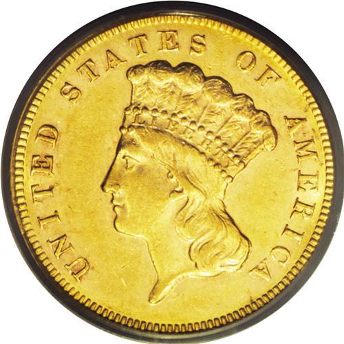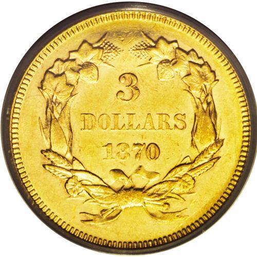 <B>1870<$3> AU55 PCGS.</B></I> Many of the dates in the late 1860s and early 1870s are extremely rare in Mint State grades, despite current population data that might suggest otherwise. At the next lower grade level, properly graded examples of these dates are still quite scarce. Here is one that is properly graded, an aesthetically pleasing Choice AU coin. Both sides have rich honey-gold color with slightly reflective surfaces and satiny luster. Only a trace of wear is noted on the highest points of the design, and the surfaces exhibit a few light abrasions. This splendid piece will serve as a fine centerpiece for a collection of these coins in the AU grades.<BR><I>From The Derrick Snider Collection.</B></I>