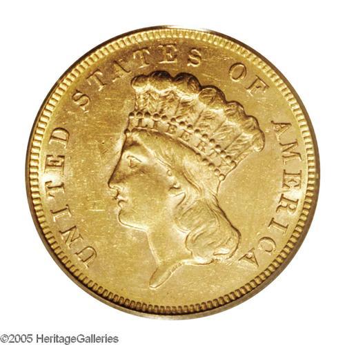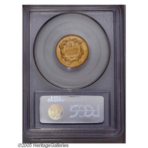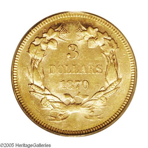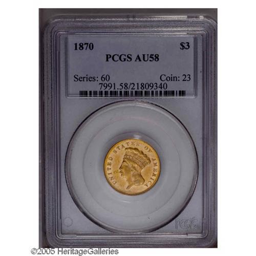 <B>1870<$3> AU58 PCGS.</B></I> Generous amounts of mint brilliance are still readily evident on this lightly circulated gold coin. Although quite heavily abraded throughout, the devices display ample remaining detail. A scarce issue with an original output of only 3,535 pieces, this specimen would fit nicely into a better date type set.
