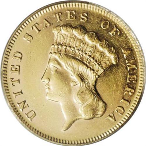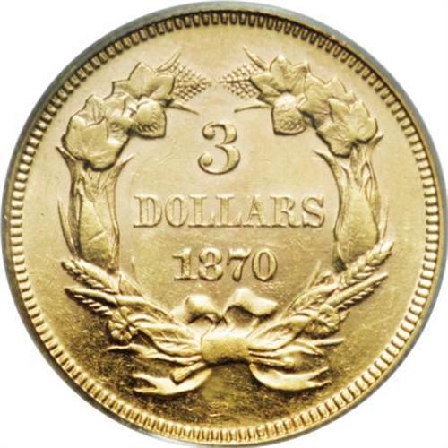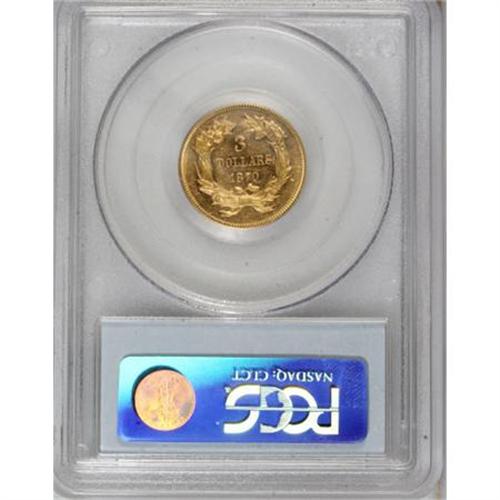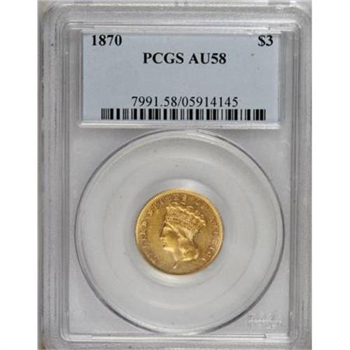 <B>1870 $3 AU58 PCGS.</B></I> The 1870 three dollar, from a mintage of 3,500 business strikes, is challenging in About Uncirculated and rare in Mint State. The bright brassy-gold surfaces of this AU58 retain a good amount of luster, and exhibit sharply struck design elements. A few minor, unobtrusive circulation marks are noted over each side. Population: 28 in 58, 32 finer (9/07).<BR><BR><B>Coin Engraver:</B> James B. Longacre<BR><BR><b>Shipping:</b> Coins & Currency (<a target="_blank" href="http://www.heritageauctions.com/common/shipping.php">view shipping information</a>)