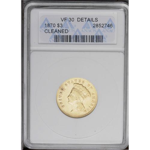 1870 $3 --Cleaned--ANACS. VF30 Details. Light yellow su 1870[$3]--Cleaned--ANACS. VF30 Details.