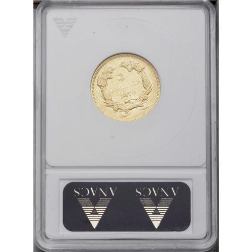 <B>1870<$3>--Cleaned--ANACS. VF30 Details.</B></I> Light yellow surfaces with minor hairlines, but undoubtedly a pleasing example, considering the conservative description by ANACS. A small patch of heavier hairlines are visible near the D of UNITED.<BR><I>From The Steve Glenn Collection, Part Two.</B></I>