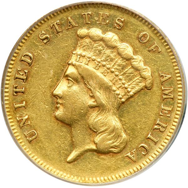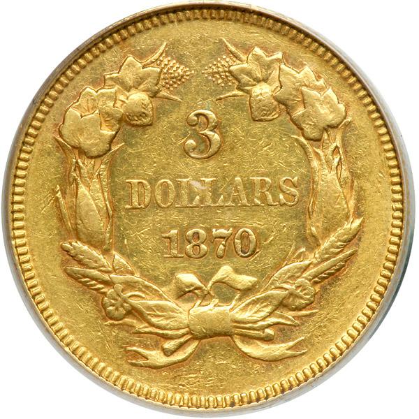 1870. PCGS graded AU-50. Delicately toned with mint luster evident within the protected areas as it glistens and sparkles. Only 3500 struck. Pop 20 (PCGS # 7991) .